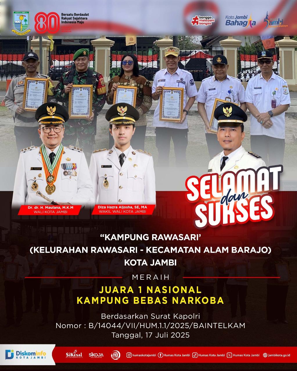 SINARJAMBI.COM – Kota Jambi kembali menorehkan prestasi membanggakan di kancah nasional. “Kampung Rawasari”, yang berada di Kelurahan Rawasari, Kecamatan Alam Barajo, sukses meraih Juara 1 Nasional dalam ajang Kampung Bebas Narkoba Tahun 2025, yang digelar oleh Mabes Polri dalam rangka memperingati Hari Bhayangkara ke-79.