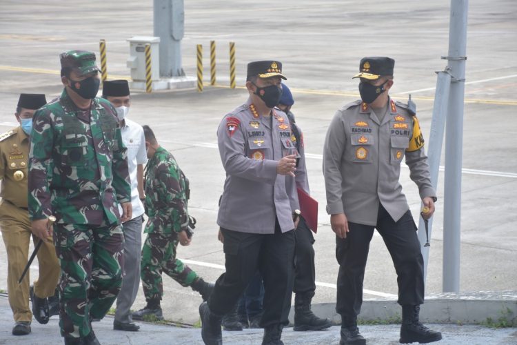 SINARJAMBI.COM – Kapolda Jambi Irjen Pol A Rachmad Wibowo, SIk bersama Gubernur Jambi Gubernur Jambi Dr. H. Al Haris, S.Sos menyambut kedatangan Panglima TNI Marsekal TNI Dr. (H.C.) Hadi Tjahjanto, S.I.P. bersama Kapolri Jenderal Polisi Drs. Listyo Sigit Prabowo, M.Si. di VVIP Room Bandara Sultan Thaha, Kota Jambi, Jum’at (17/9/21).