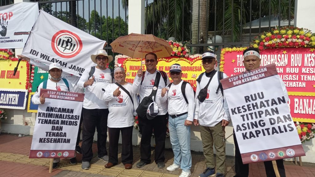SINARJAMBI.COM – Aksi penolakan Rancangan Undang Undang (RUU) Kesehatan kembali ditunjukkan praktisi kesehatan di Indonesia. Ketua IDI wilayah Jambi dr Deden memimpin rombongan dokter propinsi Jambi bergabung dengan Aksi Damai Nasional Jilid II tolak pembahasan RUU OBL Kesehatan di DPR- RI.