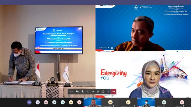 Upaya tersebut diwujudkan dengan kerjasama antara PT Perusahaan Gas Negara (Persero) – PGN sebagai Subholding Gas dan PT Pertamina Internasional Shipping (PIS) sebagai Subholding Shipping dan Integrated Marine Logistic Company untuk optimasi pengelolaan dan penyediaan Liquified Natural Gas (LNG) nasional yang terintegrasi di Pertamina Group. Sinergi ditandai dengan penandatanganan Head of Agreement (HoA) kerjasama mengenai penyediaan LNG carrier dan fasilitas bunkering LNG oleh Direktur Utama PGN, M. Haryo Yunianto dan Direktur Utama PIS, Erry Widiasto disaksikan Direktur Utama Pertamina (Persero), Nicke Widyawati pada Jumat, (25/06). Kerjasama ini diproyeksikan akan meningkatkan pemanfaatan volume LNG hingga 270 BBTUD.