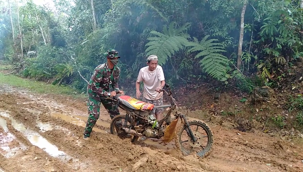 Melihat hal tersebut, anggota Satgas Pra TMMD Ke 111 Kodim 0420/Sarko Serda Dendi langsung mendorong motor hingga mennyala kembali. Selanjutnya motor warga dapat melintas di jalan penghubung yang belum diperkeras.