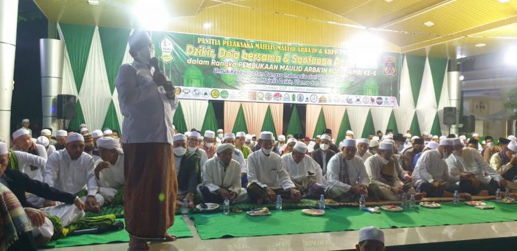 SINARJAMBI.COM – Wakil Walikota Jambi Dr. dr. H. Maulana, MKM menghadiri peringatan pembukaan Maulid Arbain (40 hari) Nabi Muhamad SAW dengan kegiatan dzikir, doa dan santunan anak yatim yang dilaksanakan majelis maulid arbain dan KBPP di Gentala Arasy Arab Melayu Pelayangan, Kamis (7/10) malam.
